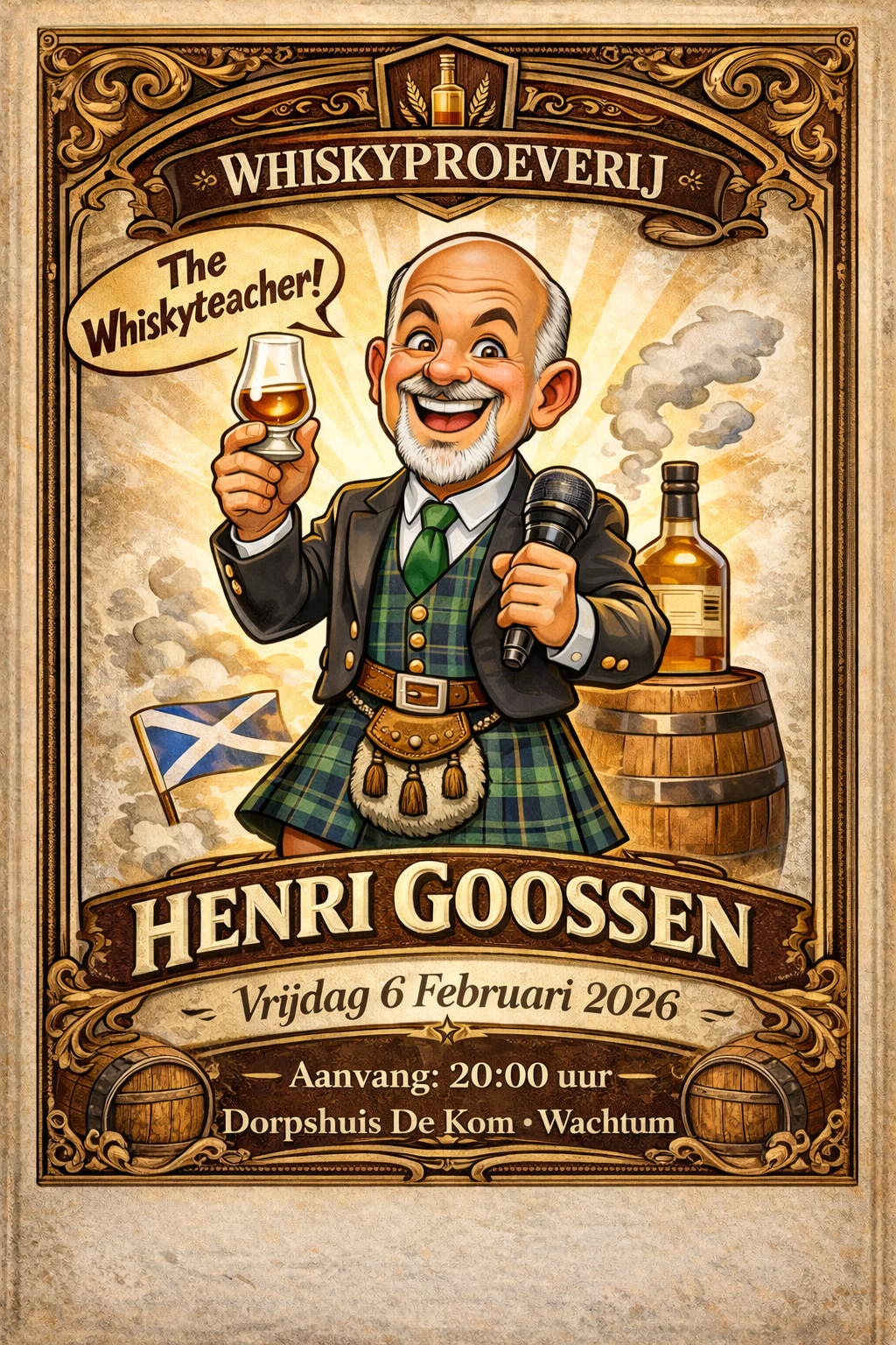 31 december 2026WHISKYPROEVERIJ MET HENRI GOOSSEN IN DORPSHUIS DE KOM The Whiskyteacher in levende lijve! Dorpshuis De Kom – Wachtum Start:&...