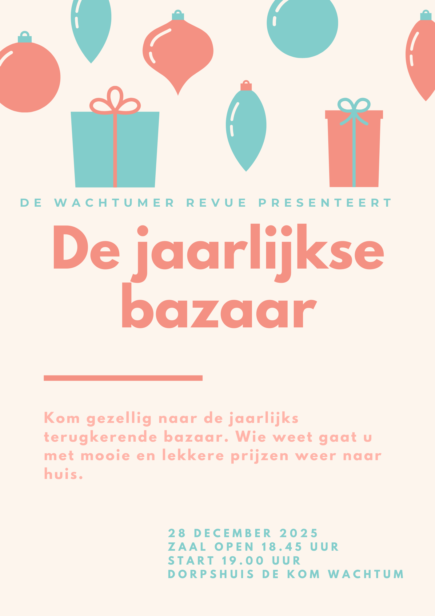 11 december 2025Kom 28 december gezellig naar de jaarlijkse bazaar! Meer info op de flyer!